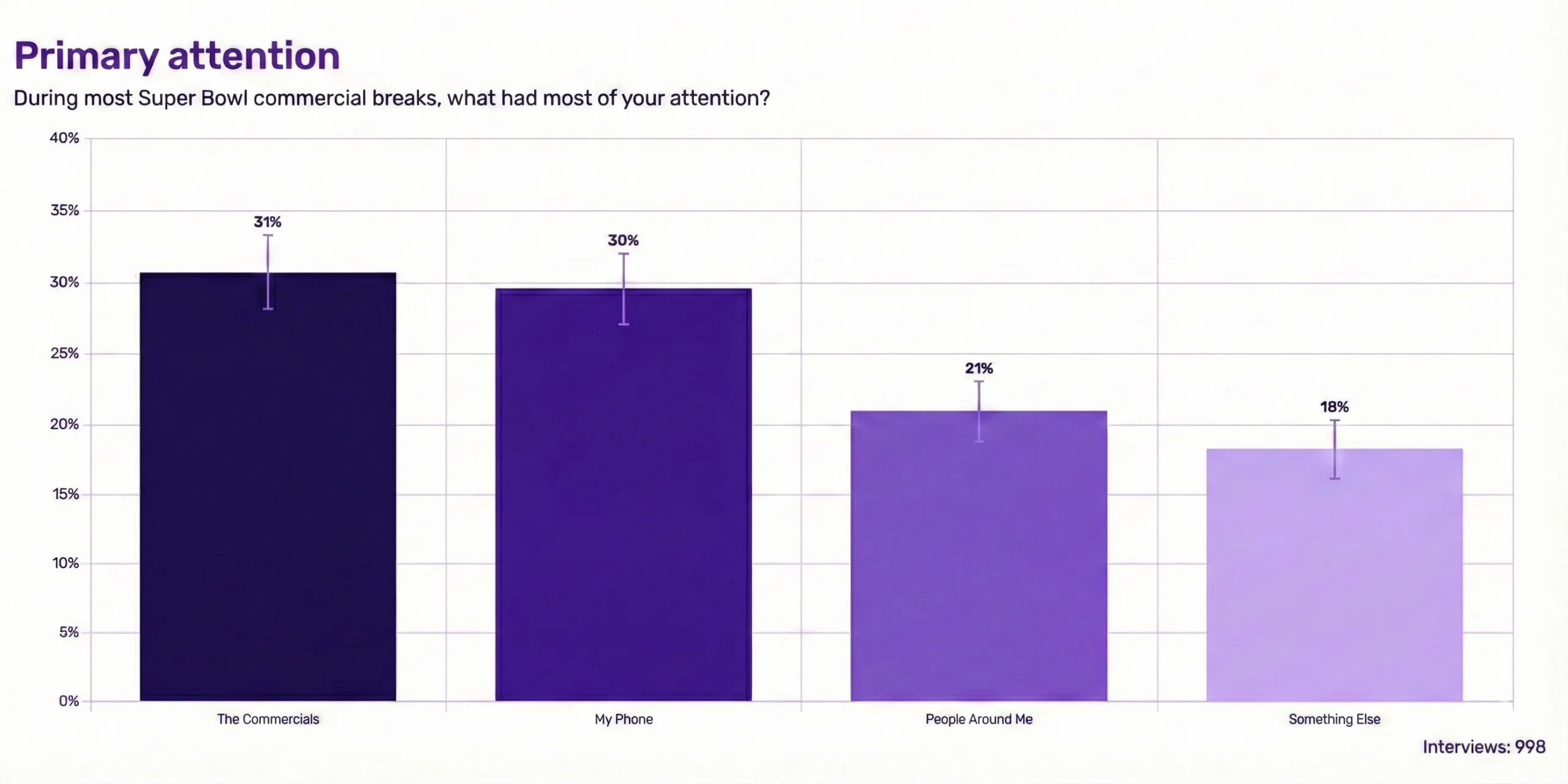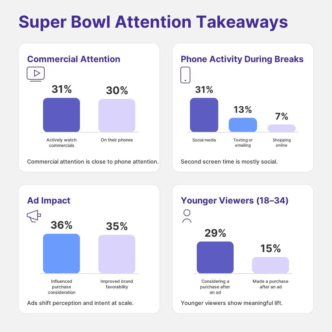 Super Bowl advertising really is about understanding how attention is distributed, who holds it, and when it turns into influence. Our findings show that attention during commercial breaks is split across screens and age groups.