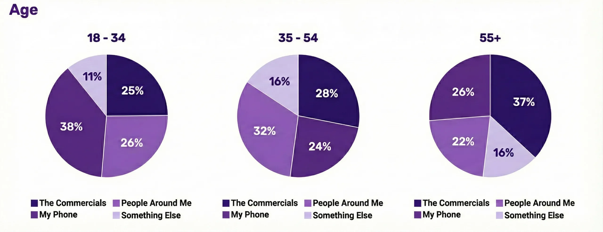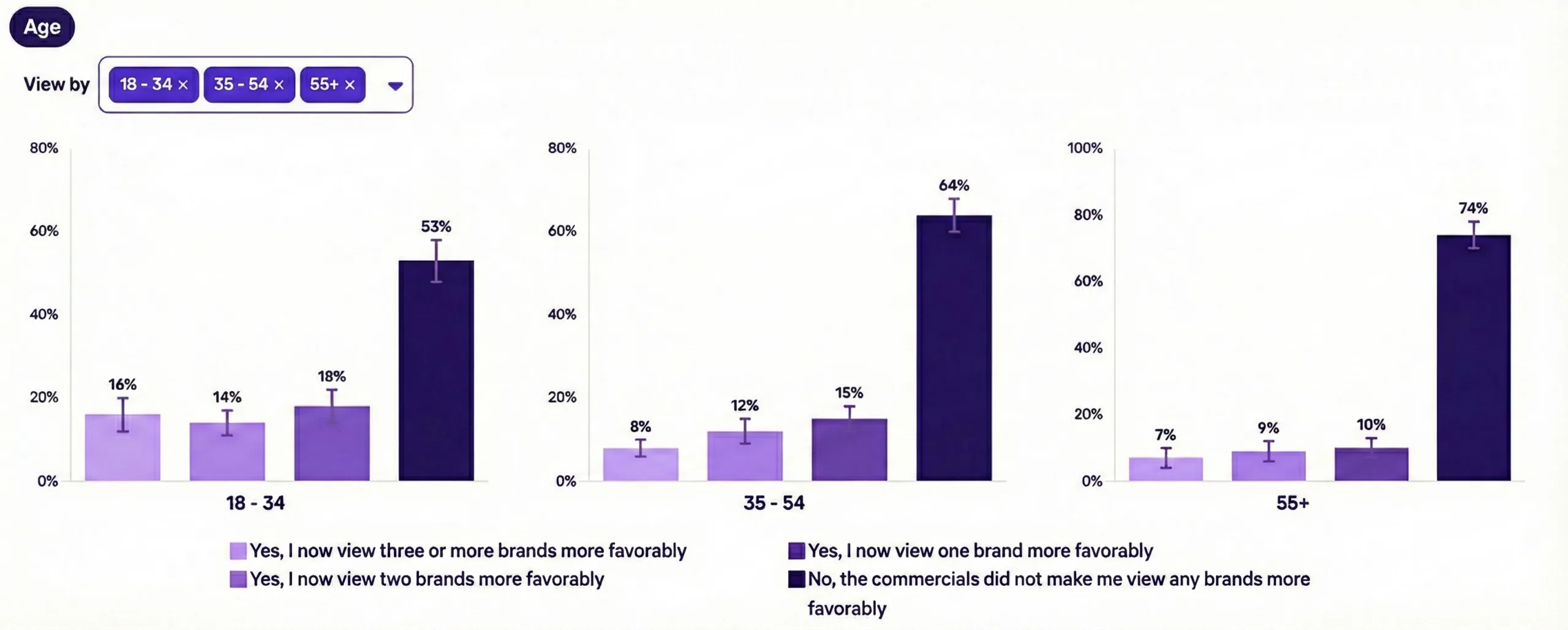 This reinforces a broader pattern across the research: while older viewers may be more attentive to commercials, younger viewers are more persuadable, making them a critical audience when brand perception and long-term growth are the goal.