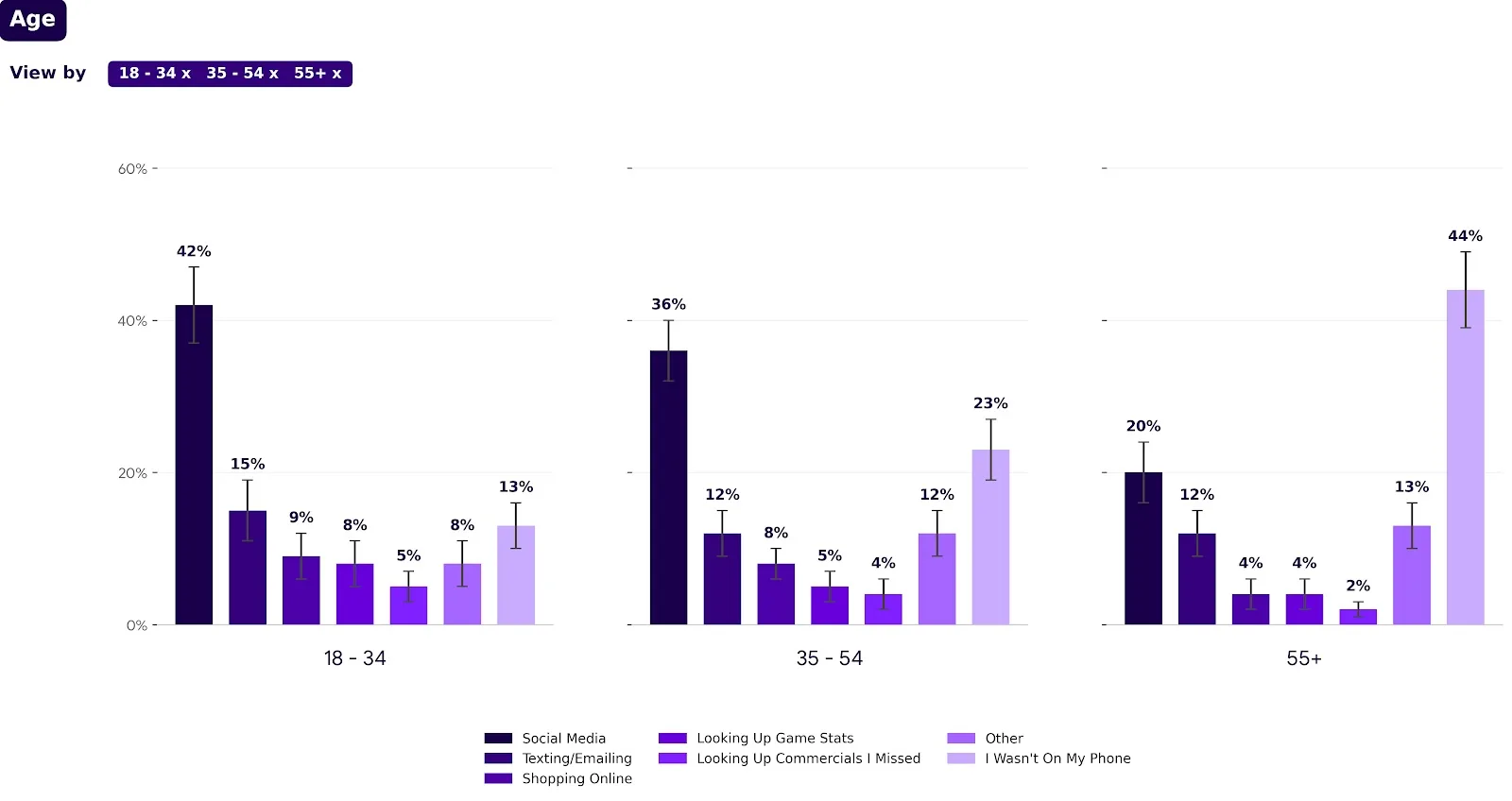 While topline results suggest Super Bowl audiences split their attention evenly between commercials and phones, age dramatically reshapes where attention actually goes.