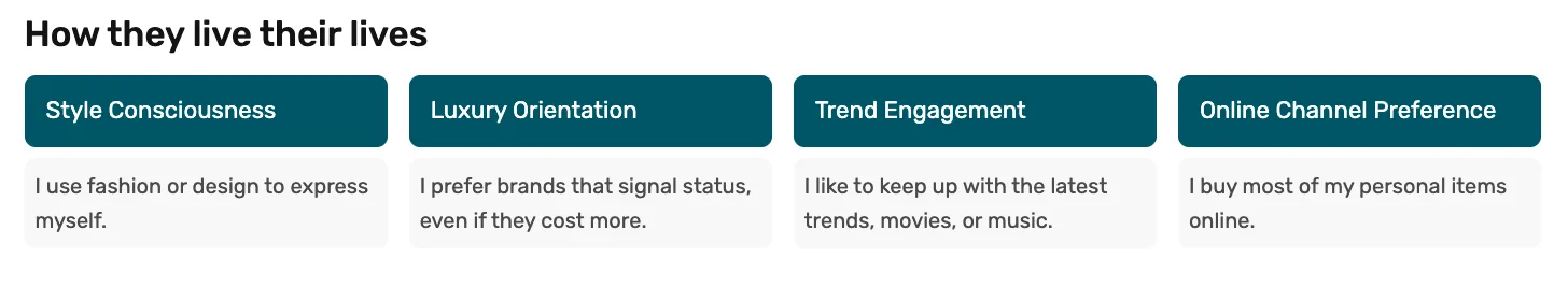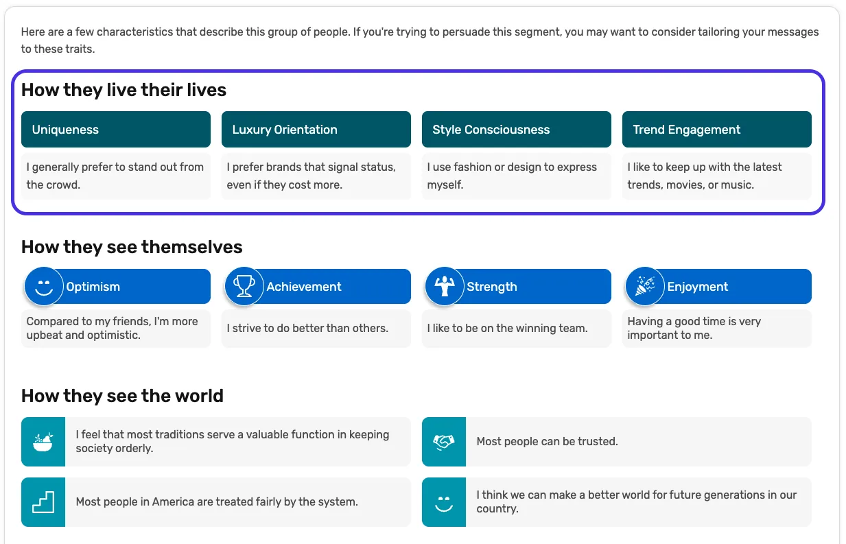 Get actionable insights into how your audience segments see themselves, and how that affects their shopping behaviors.