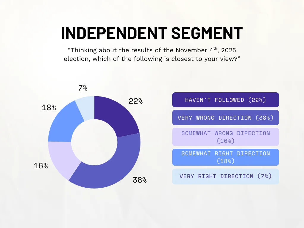 Again, while these numbers reflect feelings about the 2025 elections and the 2024 Presidential election, we gained a clearer understanding of why they answered the way they did through their open-ended responses.