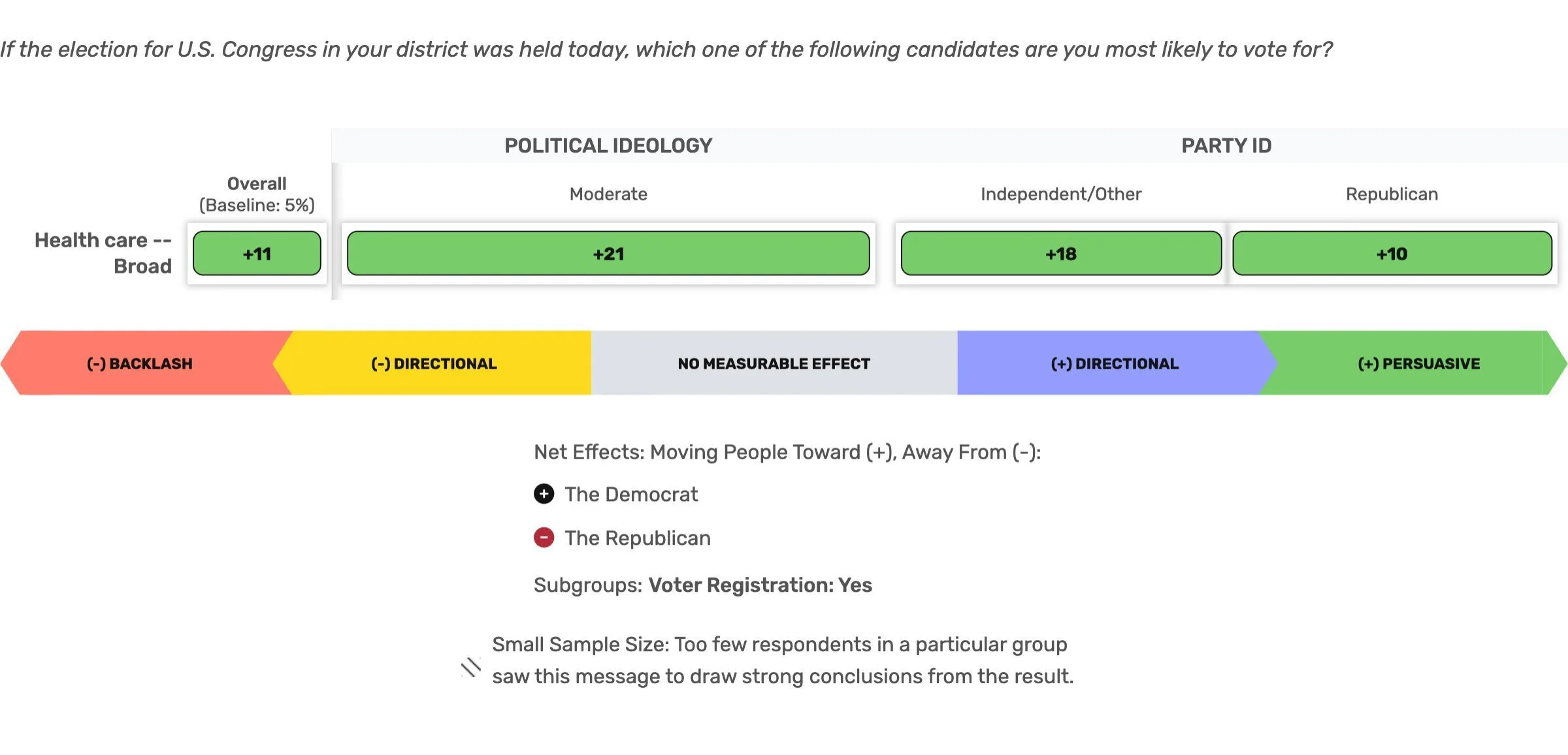 Looking at the best performing message overall on Health Care, we saw a +21 net increase in Democratic vote share among Moderates, a +18 effect among Independents, and a +10 effect among Republicans. Not only do these messages have broad appeal to sway voters on anticipated vote choice, they can also be used to persuade those who are on the fence, or who often vote for Republicans.