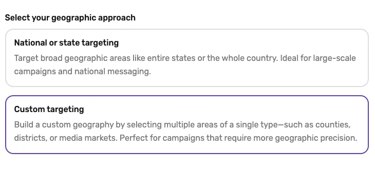 Begin by selecting your geographic approach, then layer in expanded demographic, socioeconomic, lifestyle, and political attributes to shape an audience that truly reflects who you need to hear from.